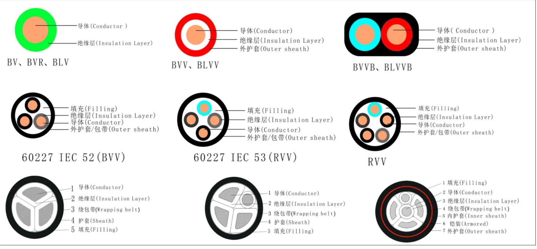 Non sheathed cables for fixed wiring. All cables comply with the appropriate requirements given in iec 60227 1 and each individual type of cable complies with the particular requirements of this part. Are given in iec 60227 2 iec 60332 1 2 and in the relevant parts of iec 60811. Flexible cables screened and unscreened with two or more conductors issued as iec 60227 7.